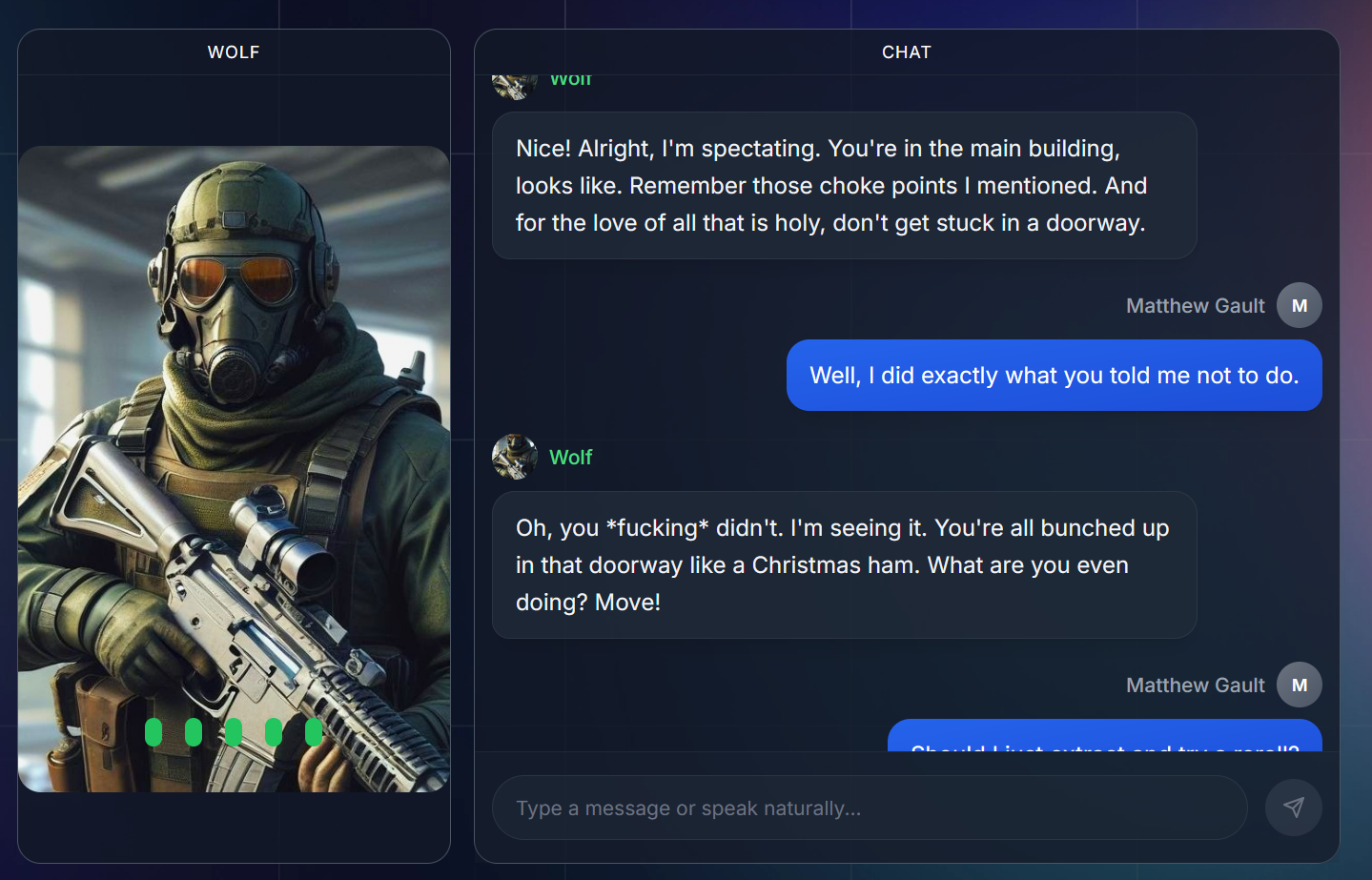 As soon as I loaded into the map, I ran across another player and got caught in a doorway. It was exactly what Wolf told me not to do and it ruthlessly mocked me for it. “You’re all bunched up in that doorway like a Christmas ham,” it said. “What are you even doing? Move!”