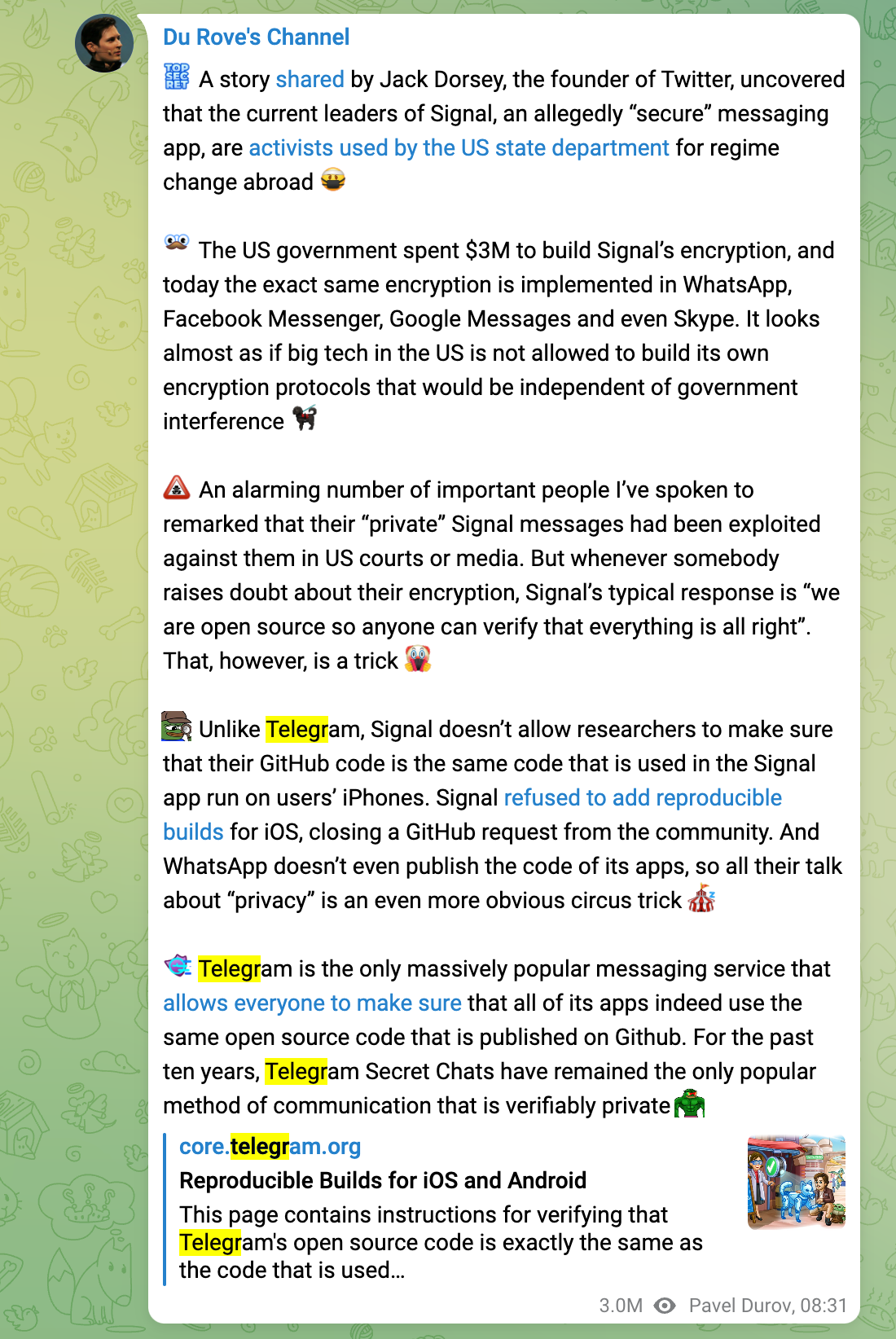 Most importantly, Telegram’s Durov used Rufo’s blog post and the conservative energy behind it to promote Telegram as an alternative and made sweeping claims about the security of Signal without having anything to back it up: “A story shared by Jack Dorsey, the founder of Twitter, uncovered that the current leaders of Signal, an allegedly ‘secure’ messaging app, are activists used by the US state department for regime change abroad,” Durov wrote on his own Telegram channel. “An alarming number of important people I’ve spoken to remarked that their ‘private’ Signal messages had been exploited against them in US courts or media ... for the past ten years, Telegram Secret Chats have remained the only popular method of communication that is verifiably private.”