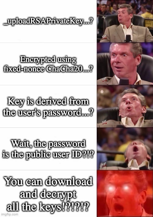 404 Media asked Dan Guido, CEO and co-founder of cybersecurity firm Trail of Bits, whether his team was able to verify the findings. Guido said the company found much the same thing, and added the app’s encryption “is meaningless,” because of the app uploading the private keys and the server’s ability to decrypt them.