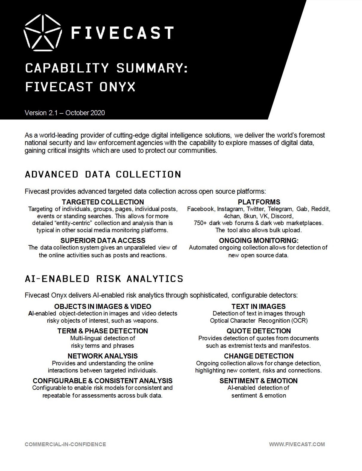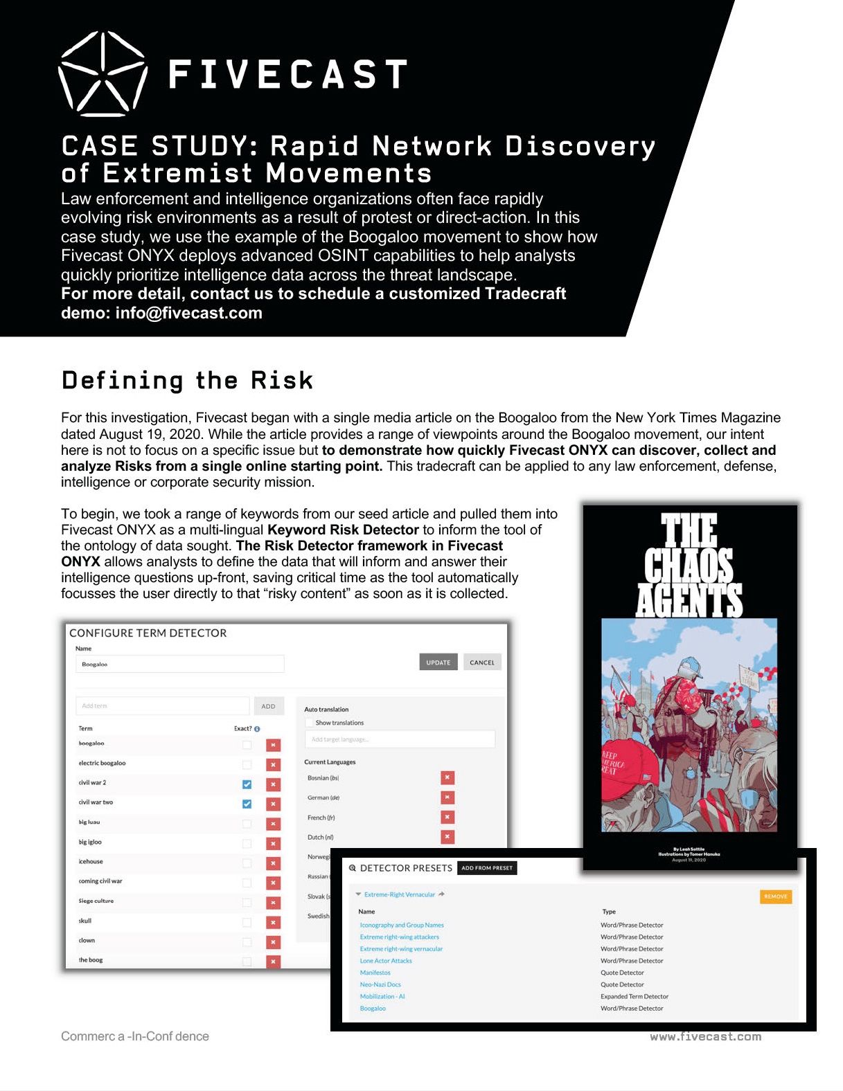 The document also includes a case study of how ONYX could be used against a specific network. In the example, Fivecast examined the Boogaloo movement, but Fivecast stresses that “our intent here is not to focus on a specific issue but to demonstrate how quickly Fivecast ONYX can discover, collect and analyze Risks from a single online starting point.”