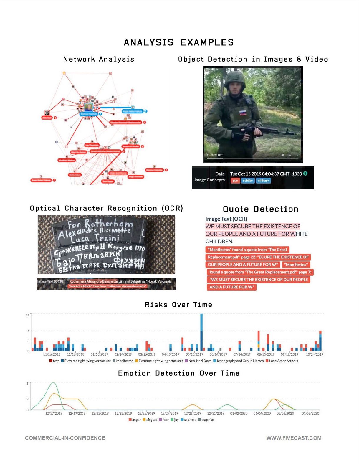 Marketing materials promote the software’s ability to provide targeted data collection from big social platforms like Facebook and Reddit, but also specifically names smaller communities like 4chan, 8kun, and Gab. To demonstrate its functionality, Fivecast promotional materials explain how the software was able to track social media posts and related Persons-of-Interest starting with just “basic bio details” from a New York Times Magazine article about members of the far-right paramilitary Boogaloo movement. 404 Media also obtained leaked audio of a Fivecast employee explaining how the tool could be used against trafficking networks or propaganda operations.