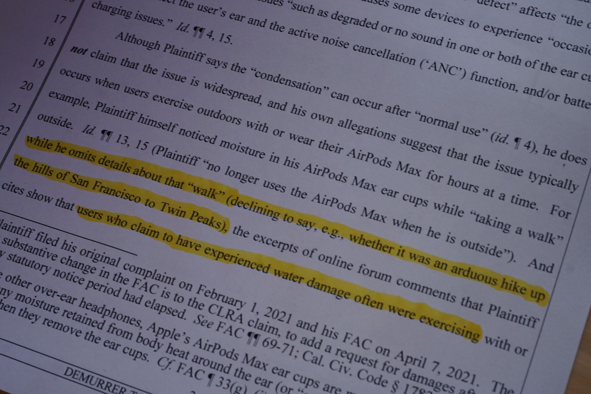 “Although Plaintiff says the ‘condensation’ can occur after ‘normal use’, he does not claim that the issue is widespread, and his own allegations suggest that the issue typically occurs when users exercise outdoors with or wear their AirPods Max for hours at a time,” they wrote. “For example, Plaintiff himself noticed moisture in his AirPods Max ear cups while ’taking a walk’ outside … while he omits details about that ‘walk’ (declining to say, e.g., whether it was an arduous hike up the hills of San Francisco to Twin Peaks), the excerpts of online forum comments that Plaintiff cites show that users who claim to have experienced water damage often were exercising with or wearing their headphones for prolonged periods.”