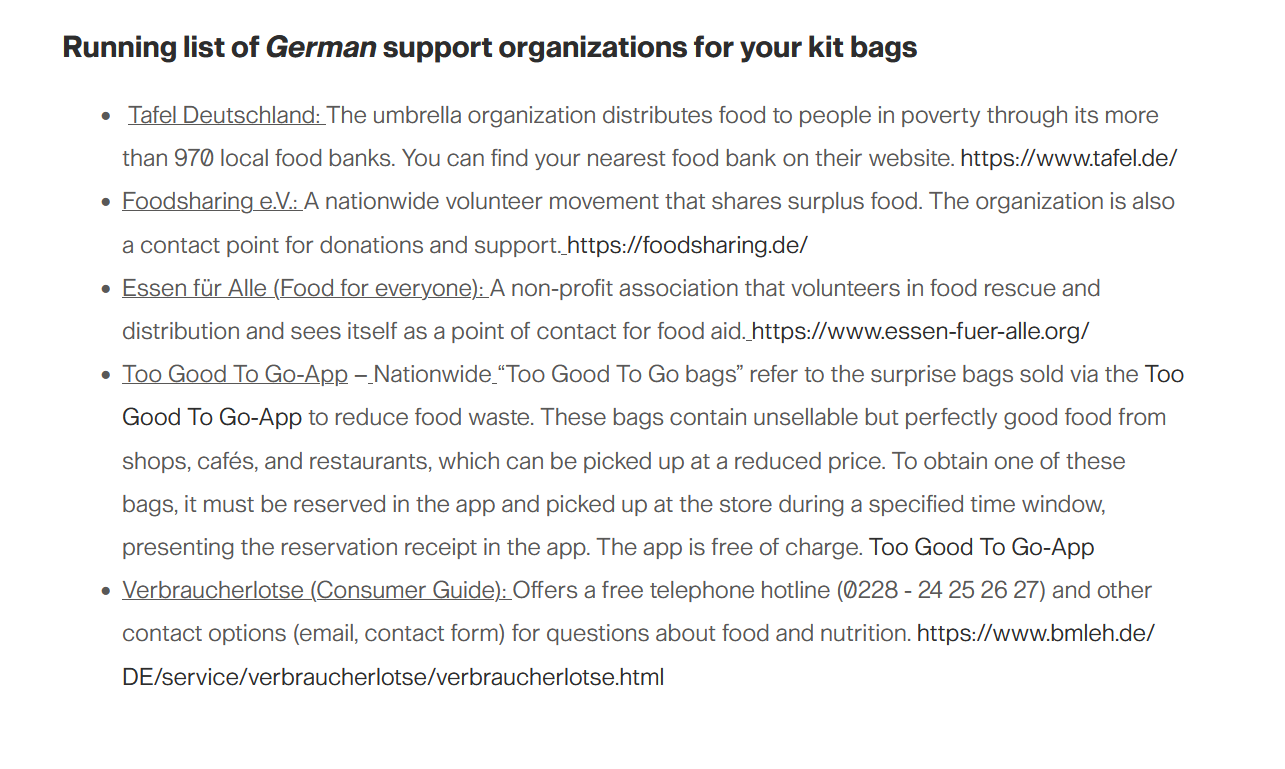 Like many other American military websites, the Garrison’s has stopped updating, but did publish a page of “Shutdown Guidance” to help the people living on its bases navigate the shutdown. At the very bottom of the page there was a “Running list of German support organizations for your kit bags” that included various local food banks. It listed Tafel Deutschland, which it called an “umbrella organization [that] distributes food to people in poverty through its more than 970 local food banks,” Foodsharing e.V, and Essen für Alle (Food for everyone).
