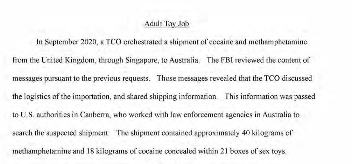 In September 2020, a drug trafficking group smuggled a shipment of cocaine and methamphetamine from the UK, through Singapore, to Australia, according to the documents. Authorities later searched the shipment, and found nearly 60 kilograms of drugs “concealed within 21 boxes of sex toys,” the documents say.