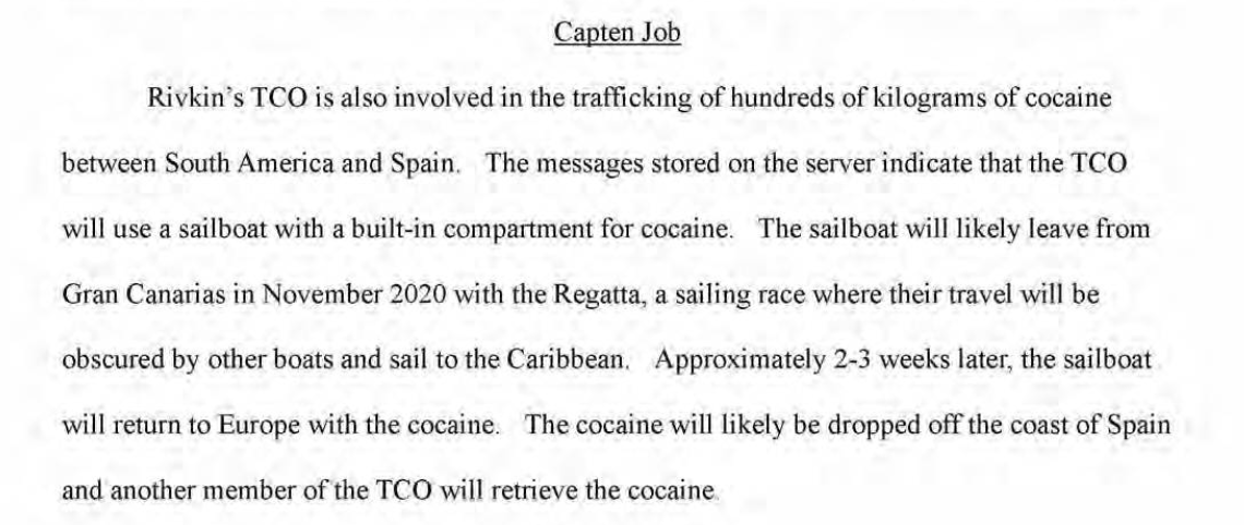 Some of the documents are formal requests for continued assistance from the U.S. to Lithuania and spell out the sort of criminal activity the FBI has seen on the Anom platform. Several sections name specific and well-known drug traffickers. One is Maximillian Rivkin, also known as “Microsoft.” As I chronicled in my book about Anom, Rivkin was a devilishly creative drug trafficker, constantly making new schemes to smuggle cocaine or other narcotics. The new documents say Rivkin’s Serbia-based organized crime group was involved in the trafficking of hundreds of kilograms of cocaine between South America and Spain. To move the drugs, the group sailed a boat during a November 2020 regatta, a sailing race, “where their travel will be obscured by other boats and sail to the Caribbean,” the documents say. Around two or three weeks later, the boat would then return to Europe with the cocaine, before being dropped off the coast of Spain where another member of the group would pick it up, the documents add.