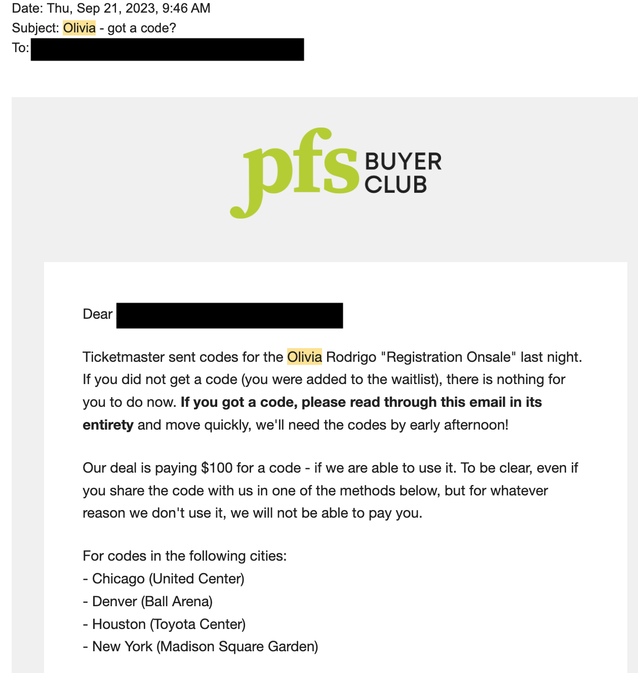 “We will be running a deal for Olivia Rodrigo Codes that will be issued next week,” an email to members of PFS Buyers Club obtained by 404 Media said. “You will need to sign up to Ticketmaster's Verified Fan before Sunday, September 17, at 10 PM ET, for a chance to get a code. Simply sign up, and if you get a code that we use, we’ll pay.”