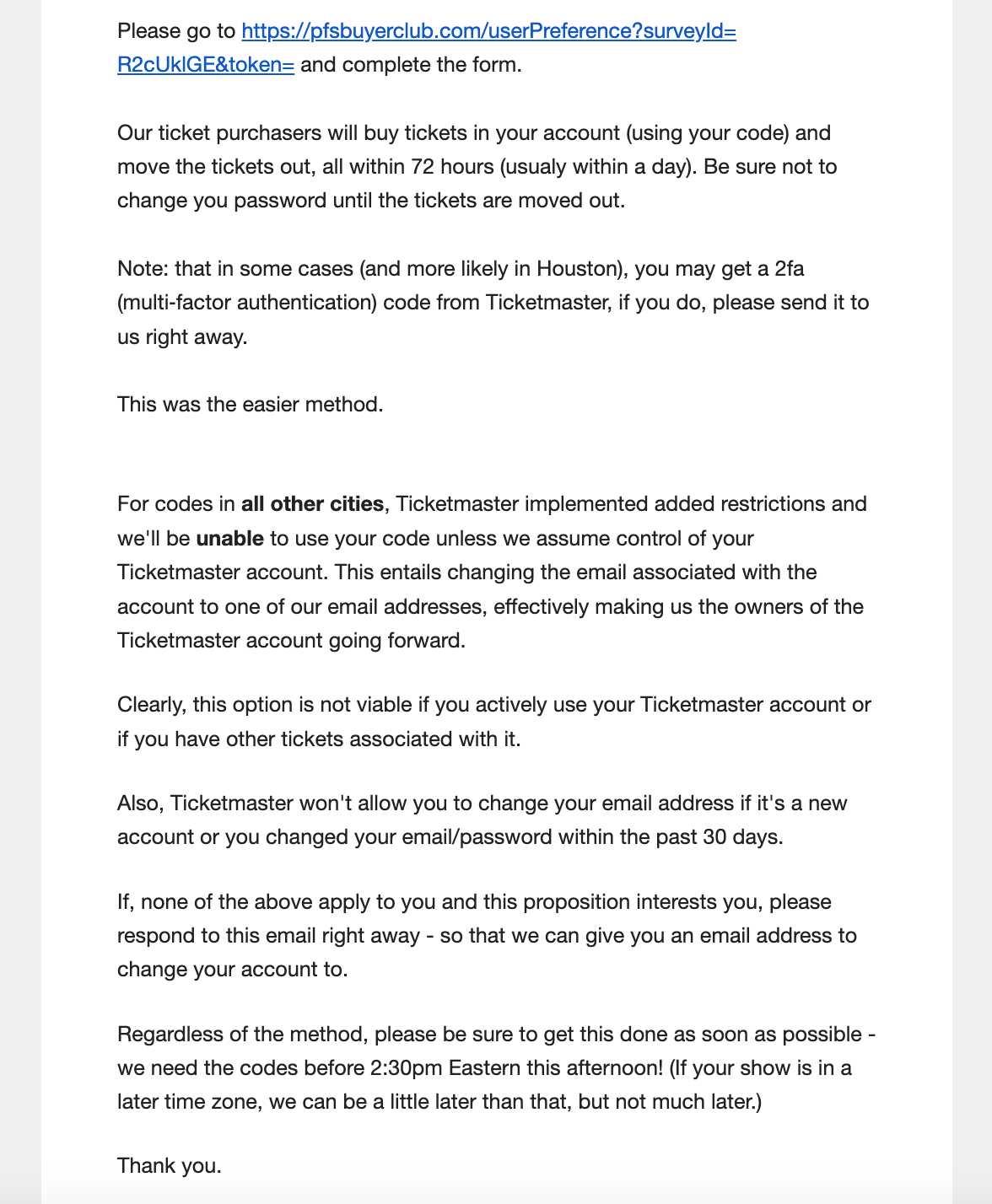 “Our deal is paying $100 for a code - if we are able to use it,” the email said. “Our ticket purchasers will buy tickets in your account (using your code) and move the tickets out, all within 72 hours (usually within a day),” another email the club sent to its members said. “Be sure not to change your password until the tickets are moved out.” The email also said that for shows in specific cities, “Ticketmaster implemented added restrictions and we’ll be unable to use your code unless we assume control of your code unless we assume control of your Ticketmaster account. This entails changing the email associated with the account to one of our email addresses, effectively making us the owners of the Ticketmaster account going forward.”