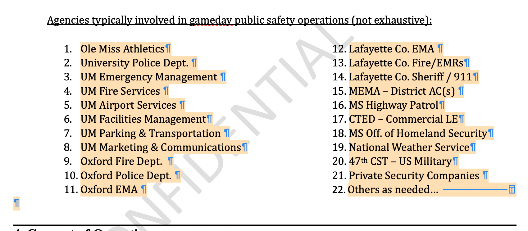 According to an Event Action Plan obtained by FOIAball, at least 11 different departments were on the ground at the Ole Miss-Georgia game, from Ole Miss campus police to a military rapid-response team.