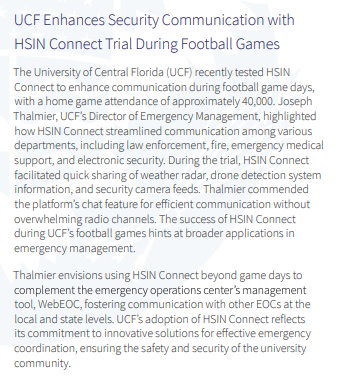 According to the 2023 annual review, HSIN Connect operated during University of Central Florida home games that season. There, both security camera and drone detection system feeds were looped into the platform in real-time.