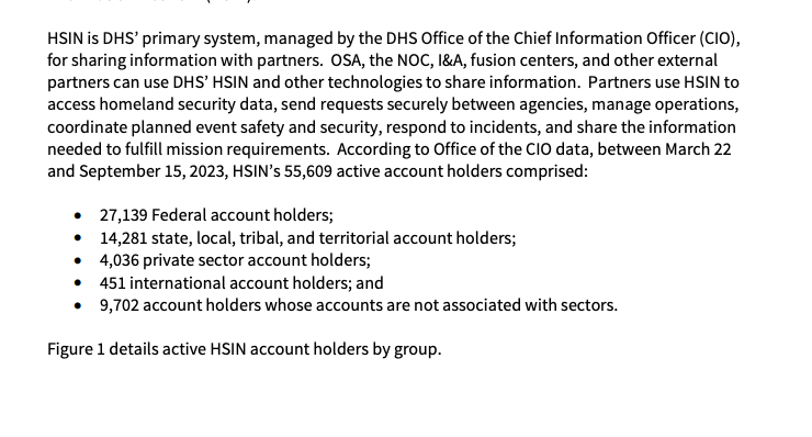 A recent Inspector General report found over 55,000 active accounts using HSIN, ranging from federal employees to local police agencies to nebulous international stakeholders.