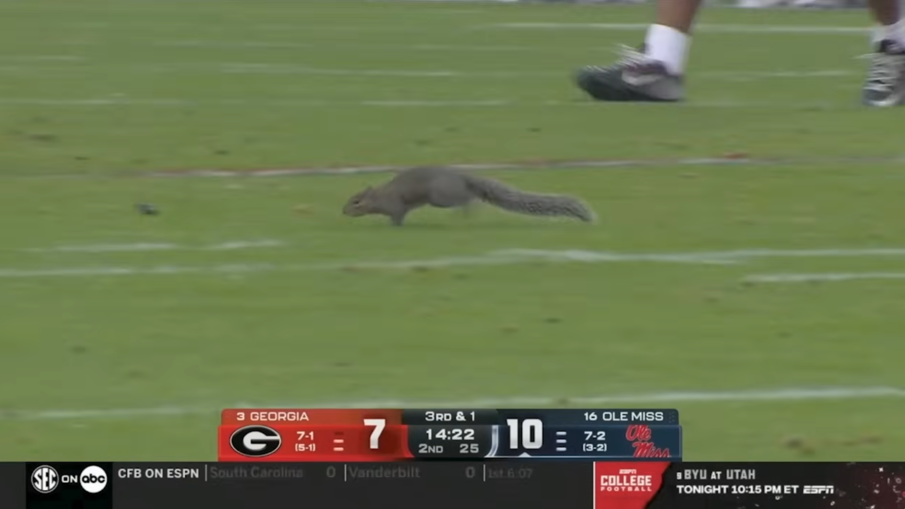 During the second quarter, a squirrel jumped onto the field, and play had to be stopped.