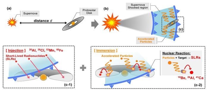 In this “immersion mechanism,” energetic cosmic rays trapped in the bath triggered SLR-producing reactions directly within the disk. This contrasts with the hypothesis that the SLRs were largely injected and then mixed up in the disk through some unknown process. This new solution can account both for the high abundance of certain SLRs, like aluminum-26, and the fact that the solar system was not destroyed, as evidenced by its apparent continued existence.