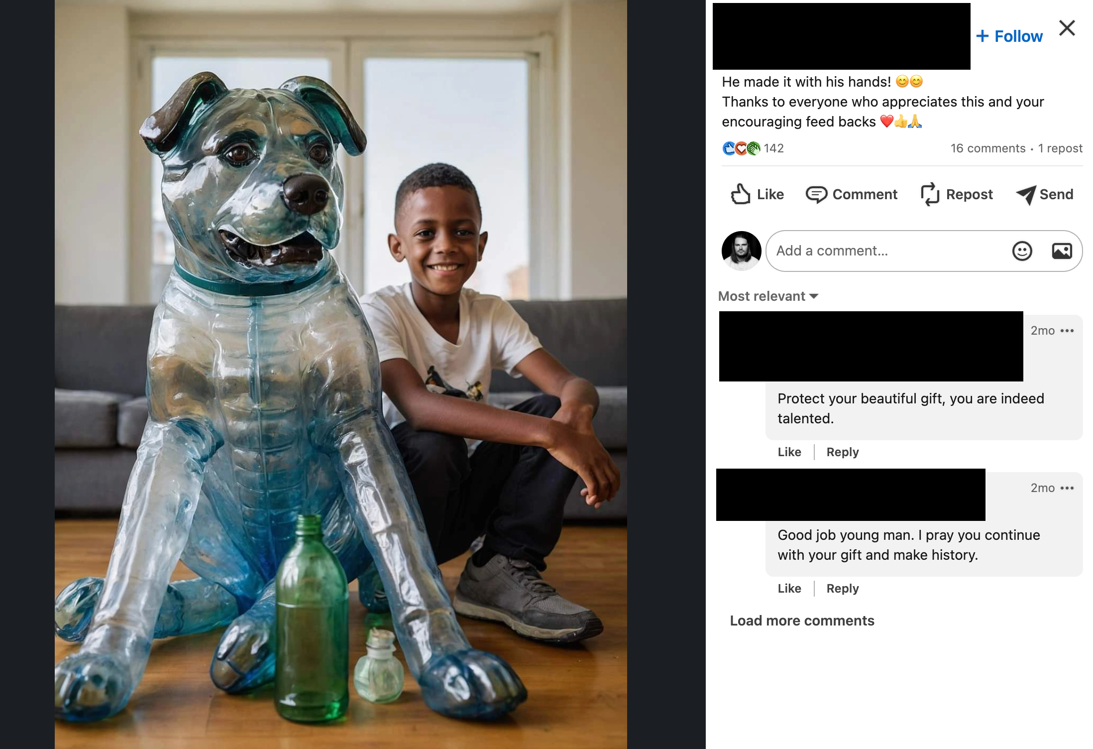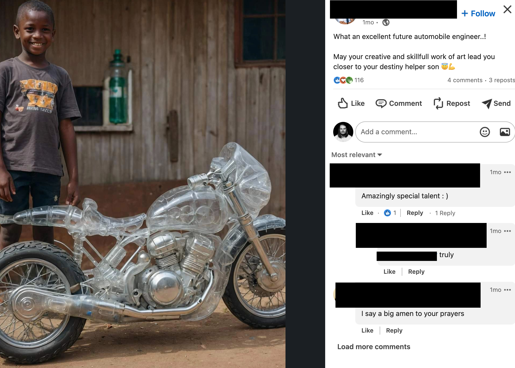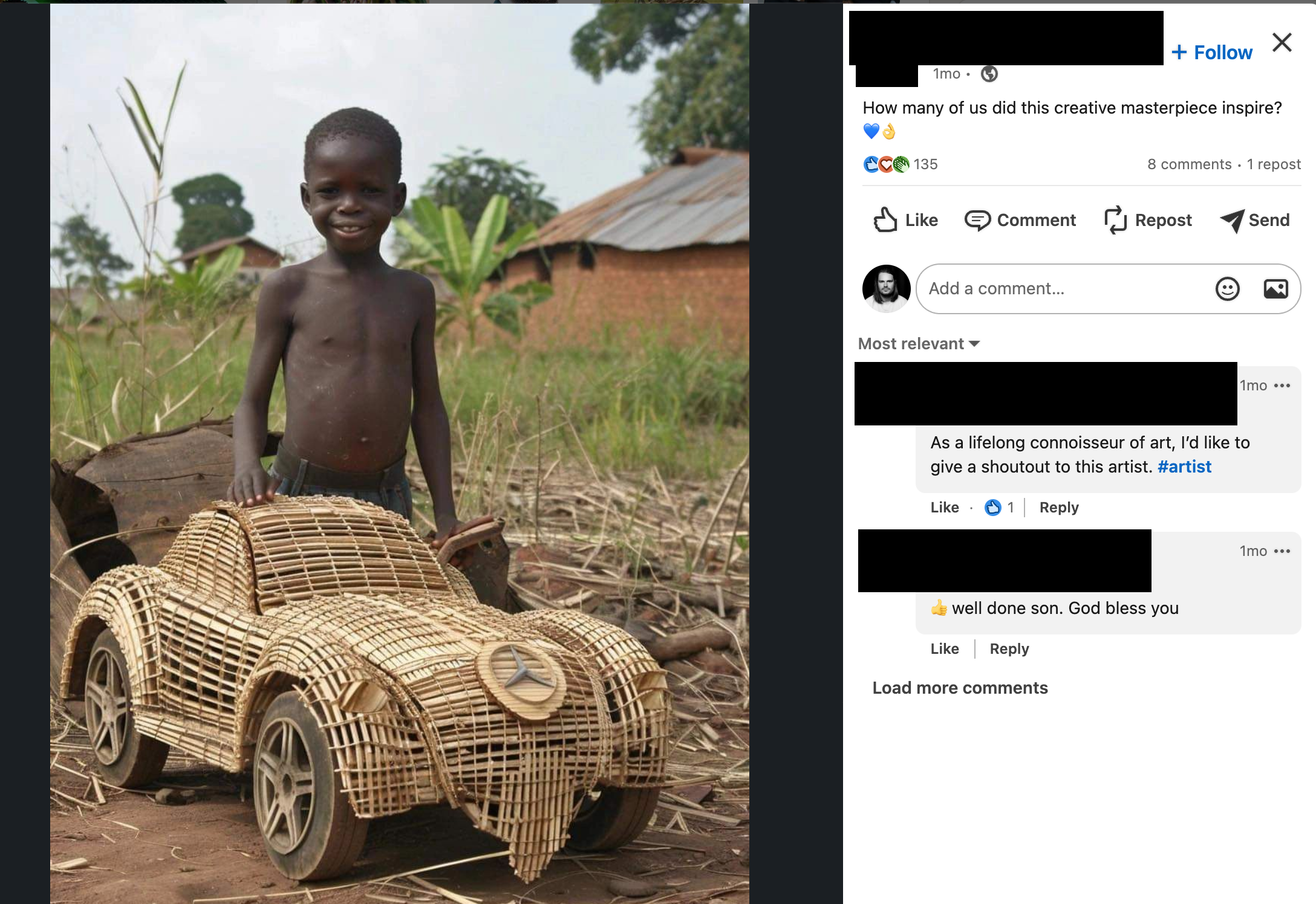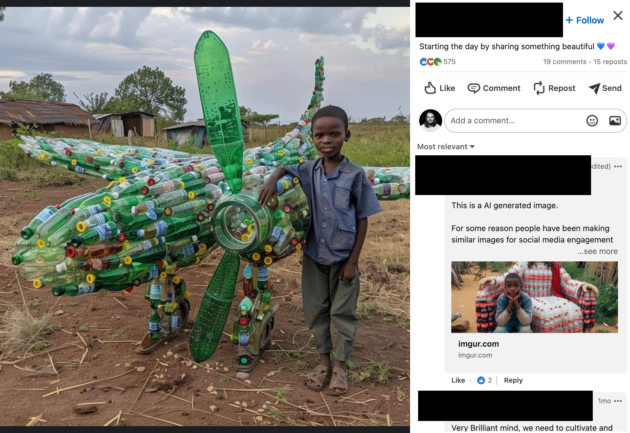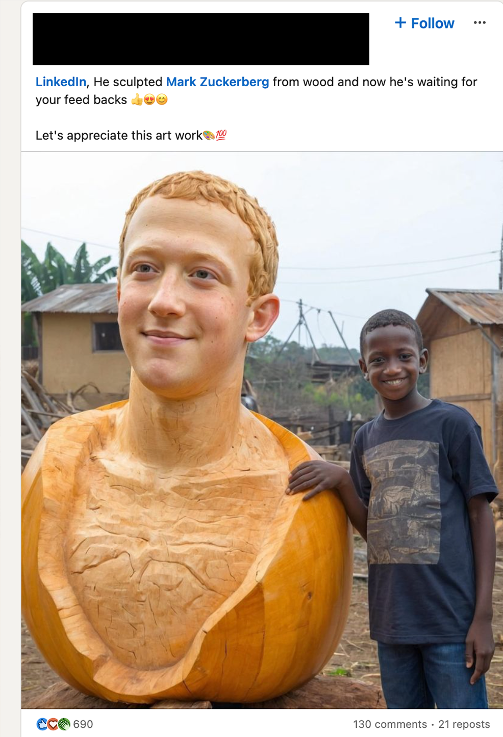 “This is an amazing work of craftsmanship, and Mark should see this,” a post featuring an AI-generated child standing next to a gigantic AI-generated gourd (or wood?) carving of Mark Zuckerberg reads. “Please, re share so this can get to Mark Zuckerberg.” The post has 1,139 reactions and had 133 comments before the creator turned them off.