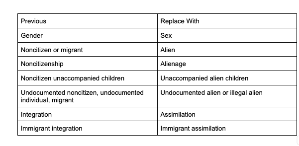 For example, FEMA employees are no longer allowed to call undocumented immigrants “migrants” or “undocumented individuals,” they must instead call them “undocumented aliens or illegal aliens.” FEMA can no longer refer to the idea of “integration,” it must begin to say “assimilation.”