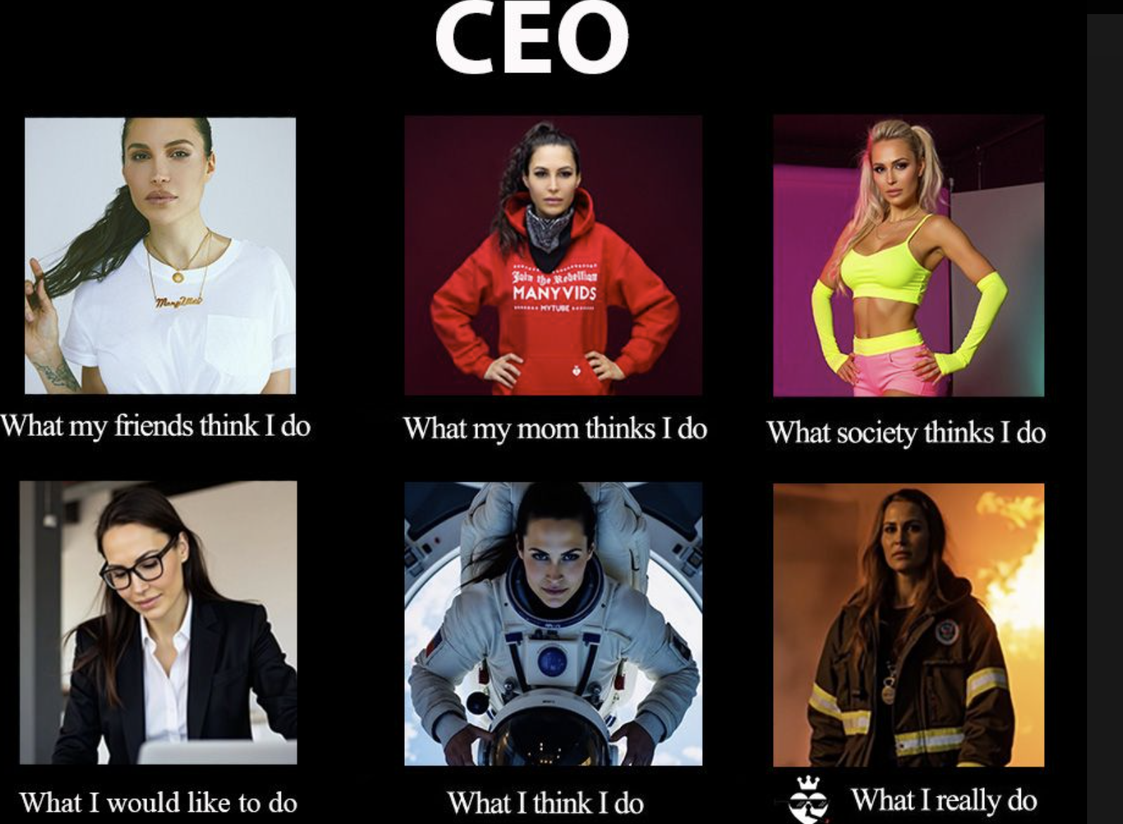 And in a third post that day, with a collage of photos and AI-generated versions of French in different occupations, including astronaut and firefighter: “At ManyVids, we choose slow truth over quick certainty. We aim to help open hearts and minds toward differences.”