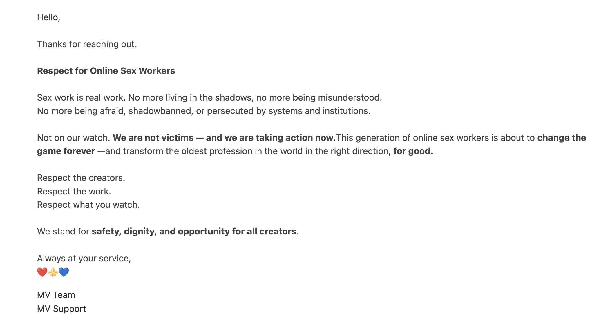 "Hello, thanks for reaching out. Respect for Online Sex Workers. Sex work is real work. No more living in the shadows, no more being misunderstood.