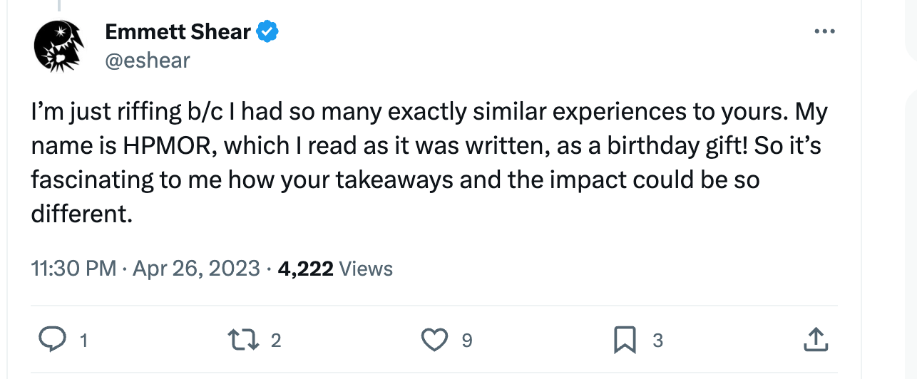 Shear has tweeted about reading Harry Potter and the Methods of Rationality (HPMOR) on multiple occasions, and said he reread it in 2022. He tweeted that his name appears in the book as a “birthday gift,” and that he read the various installments as they were released by Yudkowsky. Yudkowsky let people make “cameos” in the book if they or a friend made fan art about the book.