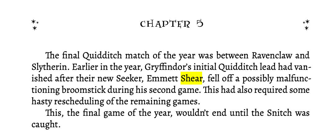 Shear is name checked near the end of the 660,000-word Harry Potter and the Methods of Rationality (HPMOR), which was written explicitly as a recruiting tool by Yudkowsky between 2010 and 2015. “The final Quidditch match of the year was between Ravenclaw and Slytherin. Earlier in the year, Gryffindor’s initial Quidditch lead had vanished after their new Seeker, Emmett Shear, fell off a possibly malfunctioning broomstick during his second game. This had also required some hasty rescheduling of the remaining games,” the passage reads.