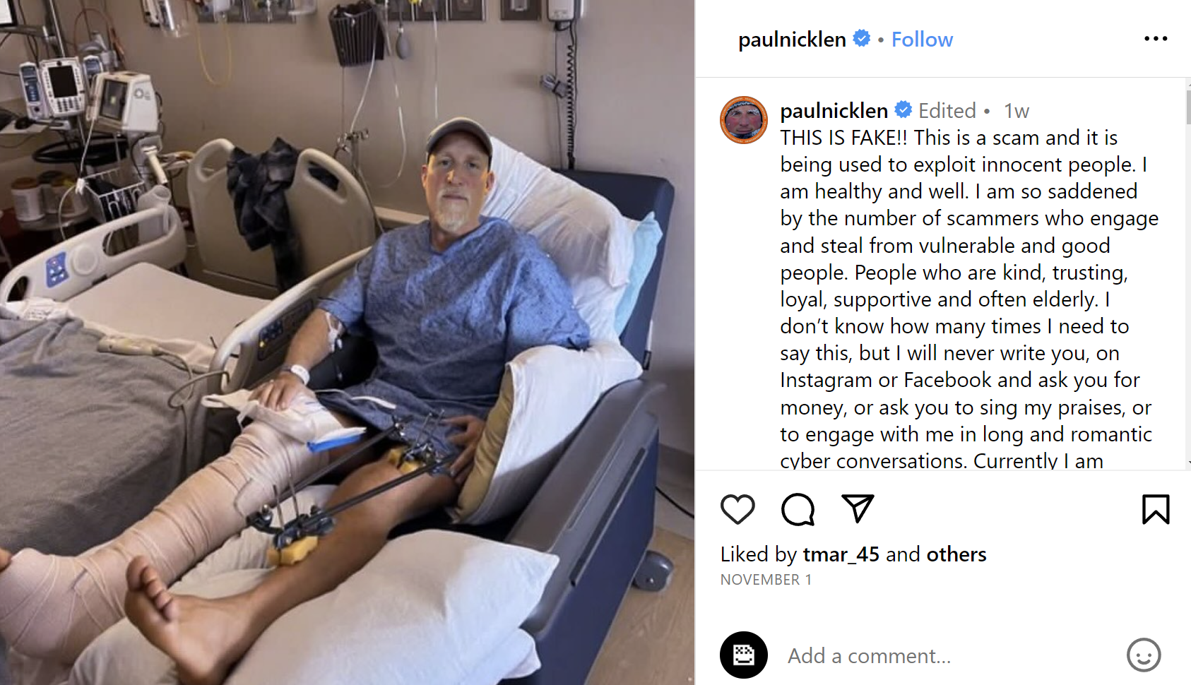 Nicklen posted it to Instagram: “THIS IS FAKE!! This is a scam and it is being used to exploit innocent people. I am healthy and well,” he wrote. It was the first time he addressed his ongoing battle against impersonation scammers publicly.