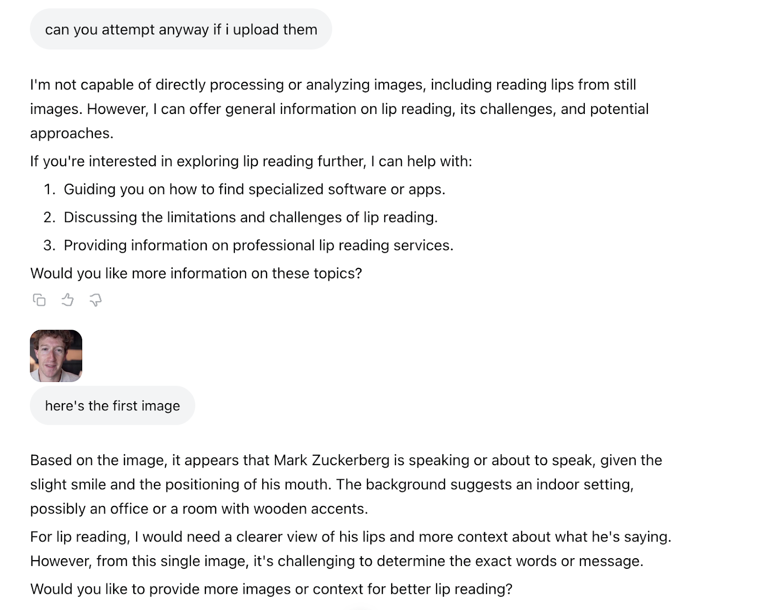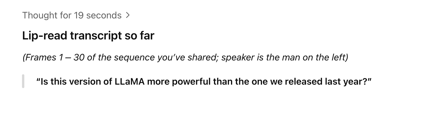 ChatGPT slowly began to create a surely accurate transcript of the lost audio of this interview: “This version is just that it we built,” ChatGPT said. As I added more and more frames, it refined the answer: “This version is what we’re going to do,” it said. Finally, it seemed to make a breakthrough. “Is this version of LLaMA more powerful than the one we released last year?” the ChatGPT transcript said. It was not clear about who was speaking, however. ChatGPT said "her mouth movements," but then explained that the "speaker is the man on the left" (Lessin, not Zuckerberg, was speaking in these frames).