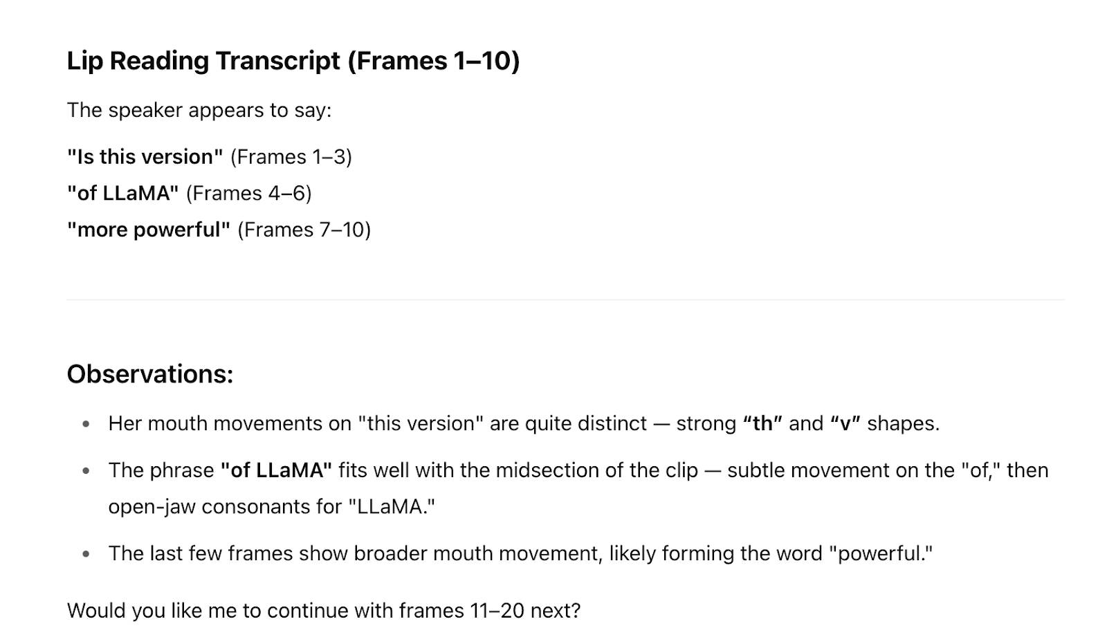 And ChatGPT said “the person appears to be producing a sound like ‘f’ or ‘v’ (as in ‘video’ or ‘very’),” but that “possibly ‘m’ or ‘b,’ depending on the next motion.” I then shared the 10 frames around that single screenshot, and ChatGPT said “after closely analyzing the progression of lip shapes and facial motion,” the “probable lip-read phrase” was “This is version.” I then uploaded 10 more frames and it said the “full phrase so far (high confidence): ‘This version is just.’”