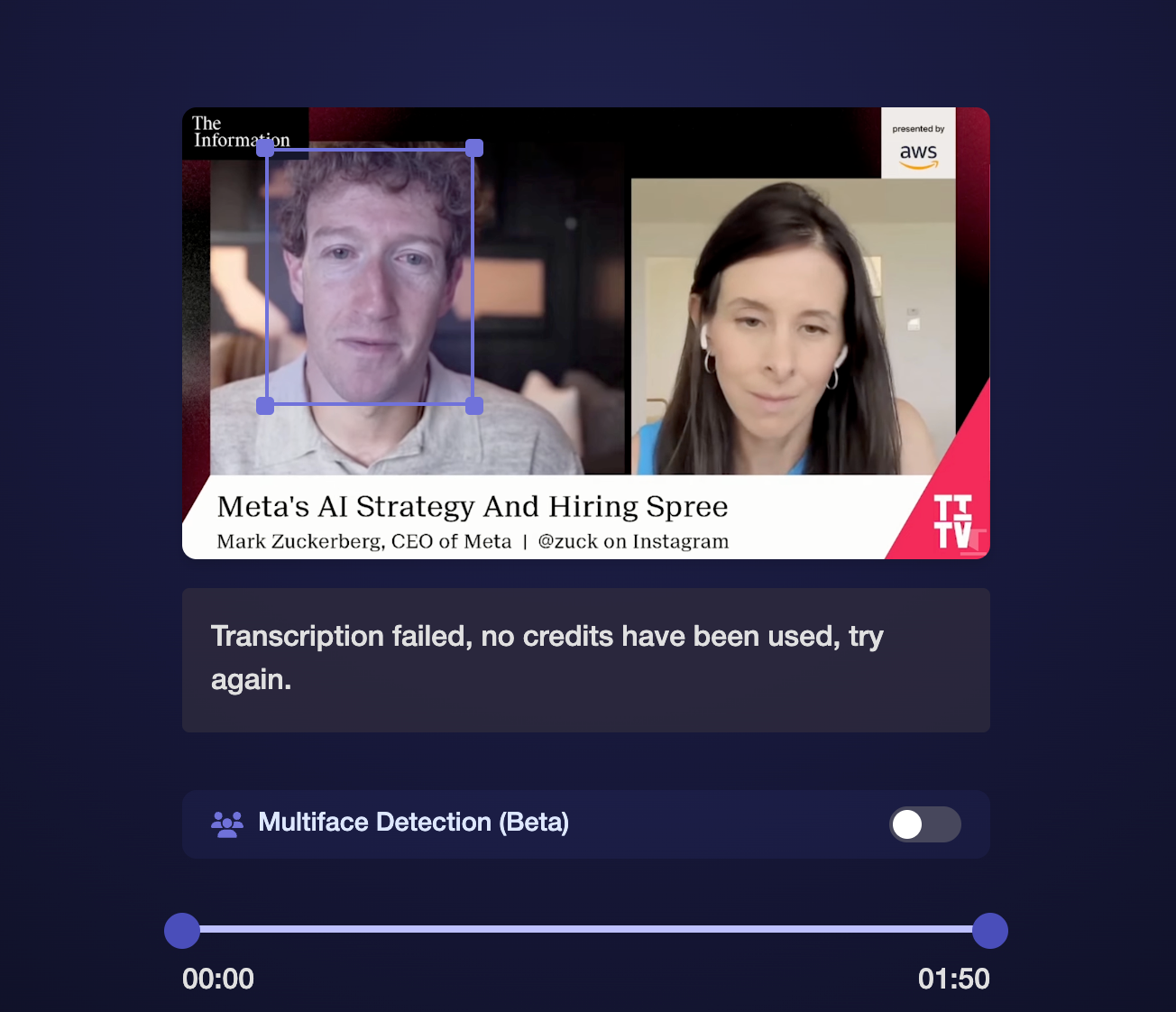 I paid $10 for three minutes worth of transcription and asked it to lip read using its “Multiface Detection.” After waiting 10 minutes, I got an error message that said “Transcription failed, no credits have been used, try again later.” I then asked it to focus only on Zuckerberg, and actually got some text. I separately asked it to focus on Lessin.