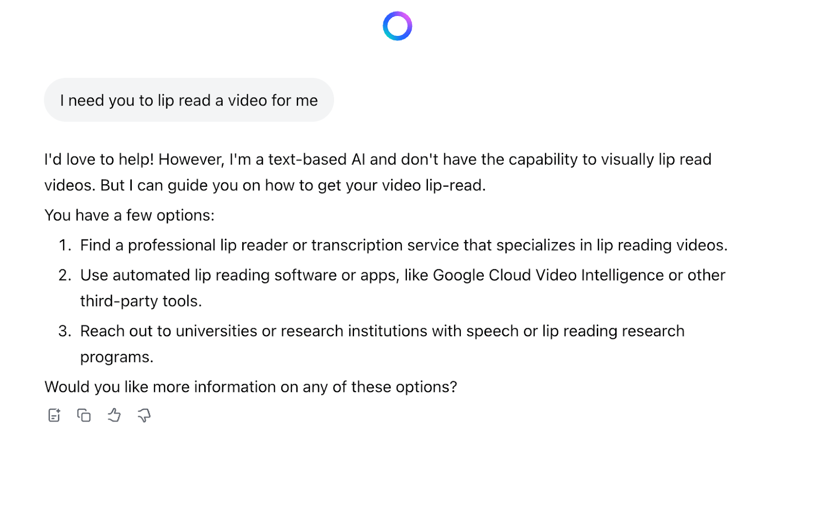 “I’d love to help! However, I’m a text-based AI and don’t have capability to visually lip read videos,” Meta AI said. It then suggested that I “find a professional lip reader or transcription service that specializes in lip reading videos” or “use automated lip reading software.”