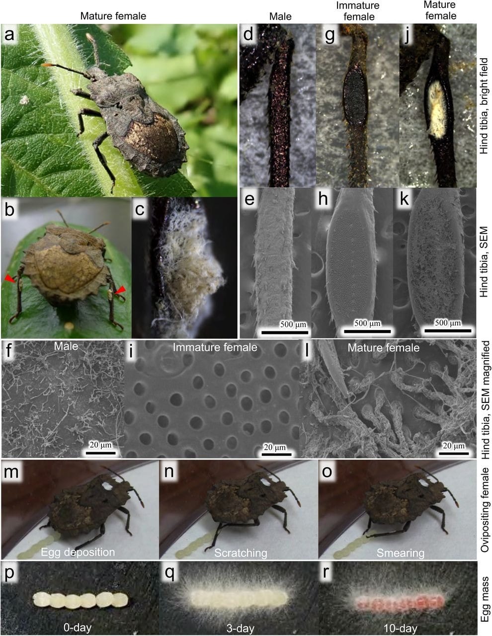 “We observed that the gravid females laid eggs in a row, and when each egg was deposited, the females rhythmically scratched the fungus-covered hindleg organ with the tarsal claws of the opposite hindleg and rubbed the egg surface, smearing the fungi onto the eggs,” the team said. “Within a few days, the fungal hyphae grew to cover the entire egg mass. On hatching, the hyphae attached to the body surface of newborn nymphs, although the fungi were subsequently lost as the nymphs molted and grew.”