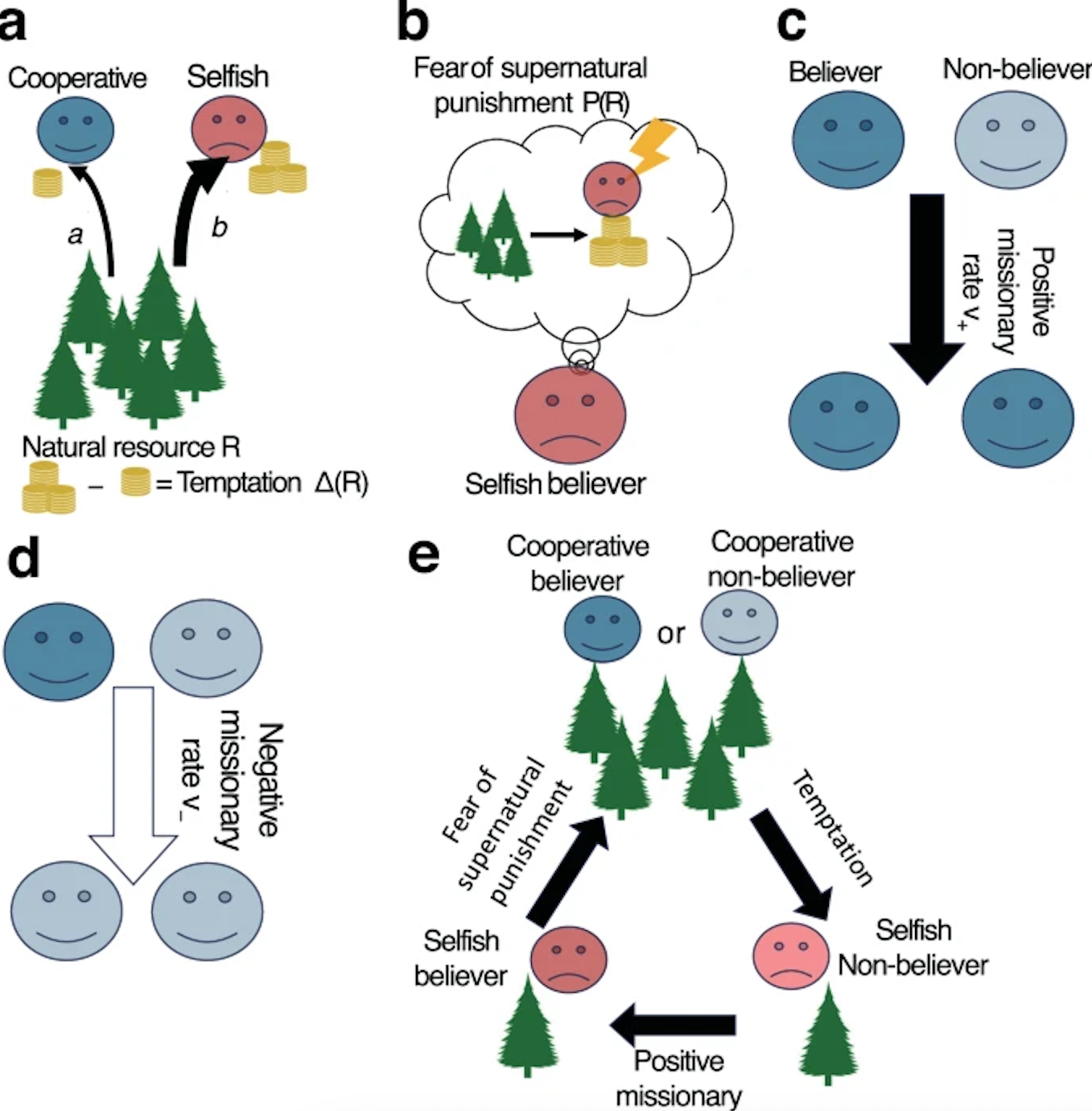 Here’s an out-of-the-box idea to save the environment: Bring back vengeful gods and spirits. In a truly delightful study, scientists explore the benefits of perceived supernatural punishment on the preservation of natural ecosystems with mathematical game theory outlined in the following illustration: