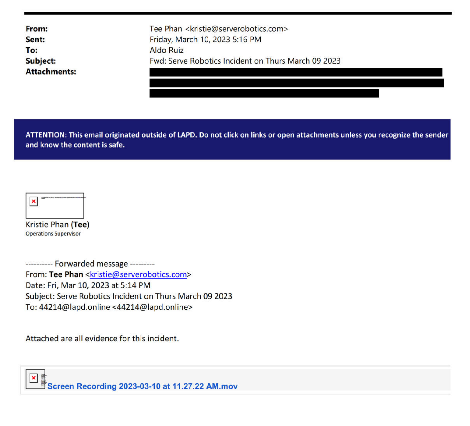 In addition to responding to the subpoena, the company also proactively emailed the video from its robot to the police in March, months earlier: “Attached are all evidence for this incident,” an email containing a .mov file sent to an LAPD officer by Serve employee Tee Phan, who was later identified in other emails as the remote driver of the robot, says.