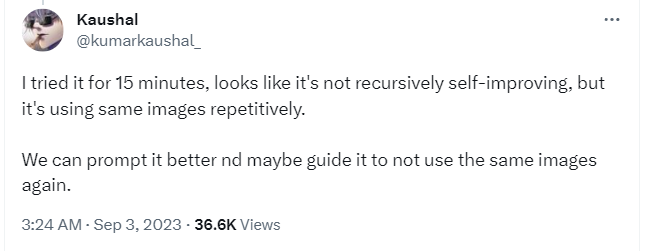 People caught onto this immediately. “I tried it for 15 minutes, looks like it's not recursively self-improving, but it's using same images repetitively,” @kumarkaushal_ said.