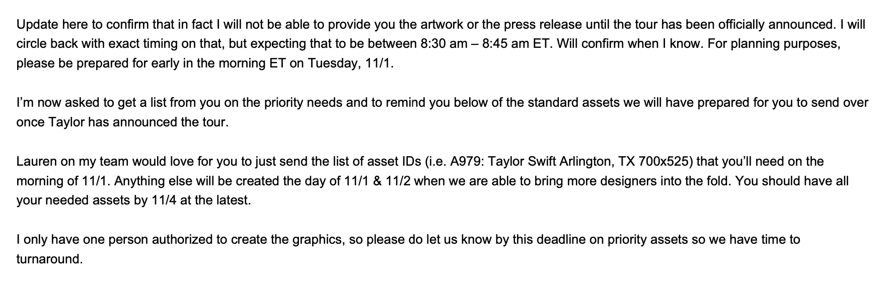 “I will not be able to provide you the artwork or the press release until the tour has been officially announced,” she wrote. “I will circle back with exact timing on that, but expecting that to be between 8:30 am - 8:45 am ET. Will confirm when I know. For planning purposes, please be prepared for early in the morning ET on Tuesday, 11/1.”