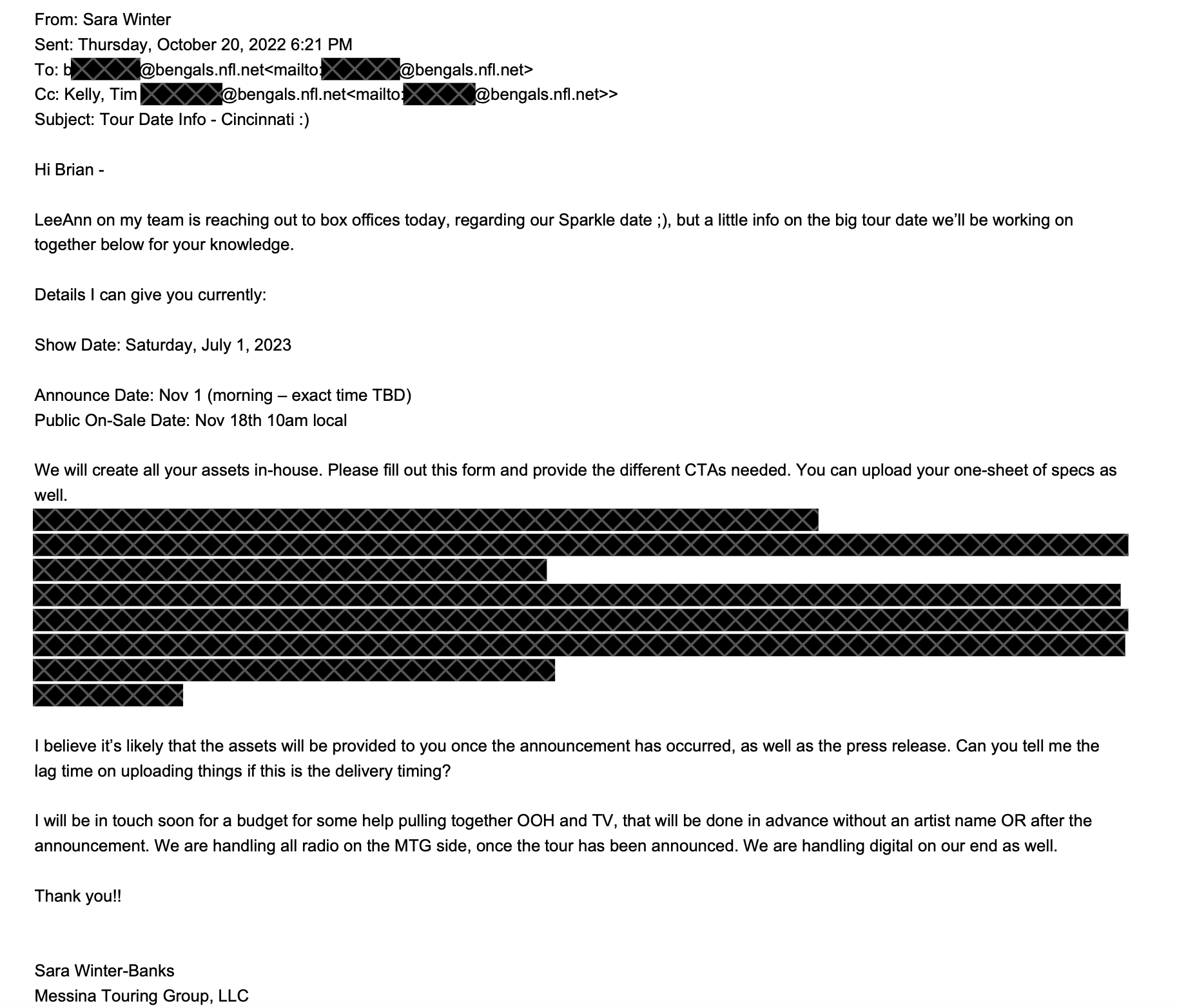 On October 20, Sara Winter-Banks of Messina Touring Group, which organized the tour, emailed event planners at the Cincinnati Bengals, who operate the 65,515-capacity Paycor Stadium, to coordinate on the rollout of “the big tour date we’ll be working on together.”