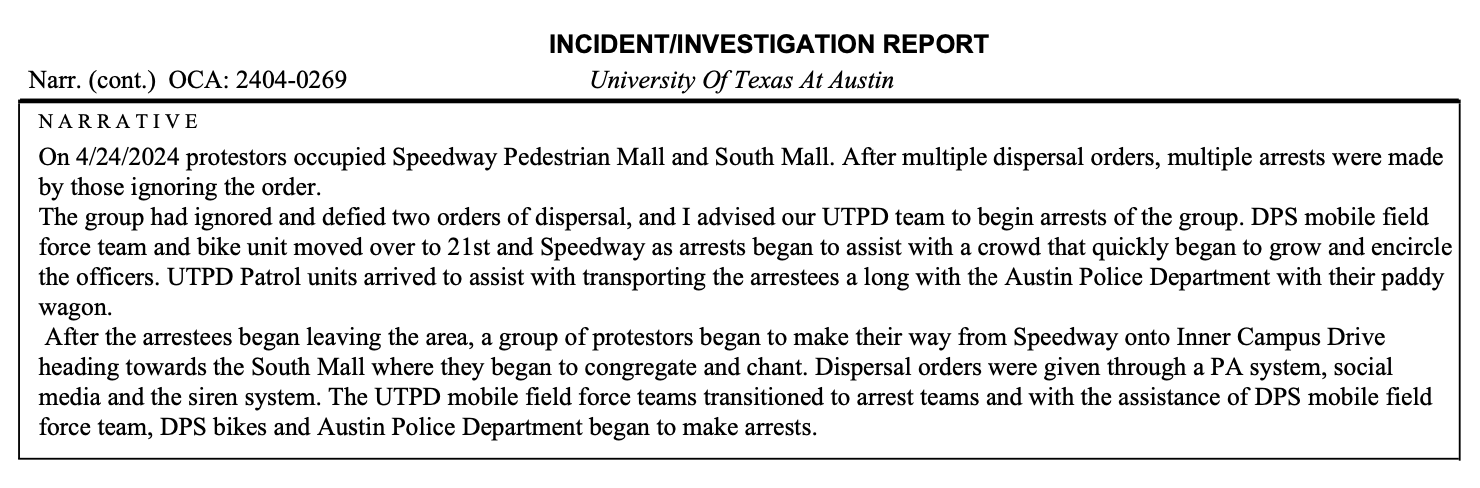 After the arrestees began leaving the area, a group of protestors began to make their way from Speedway onto Inner Campus Drive heading towards the South Mall where they began to congregate and chant. Dispersal orders were given through a PA system, social media and the siren system. The UTPD mobile field force teams transitioned to arrest teams and with the assistance of DPS mobile field force team, DPS bikes and Austin Police Department began to make arrests.”