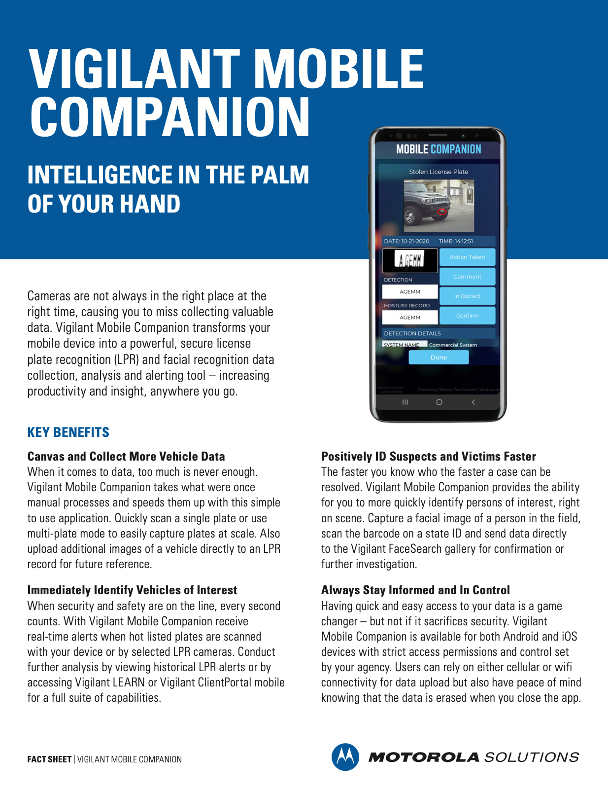 The Mobile Companion app lets users contribute to that dataset while on the move, according to other marketing material available online. Users can get push notifications when the Motorola surveillance network detects a hot listed vehicle (meaning a specific license plate or vehicle law enforcement is looking for), and can look at license plate results in a specific location across time, to see what other vehicles had been there. The mobile app is also capable of capturing faces and uploading them to the Vigilant FaceSearch gallery, which is the company’s facial recognition tool.