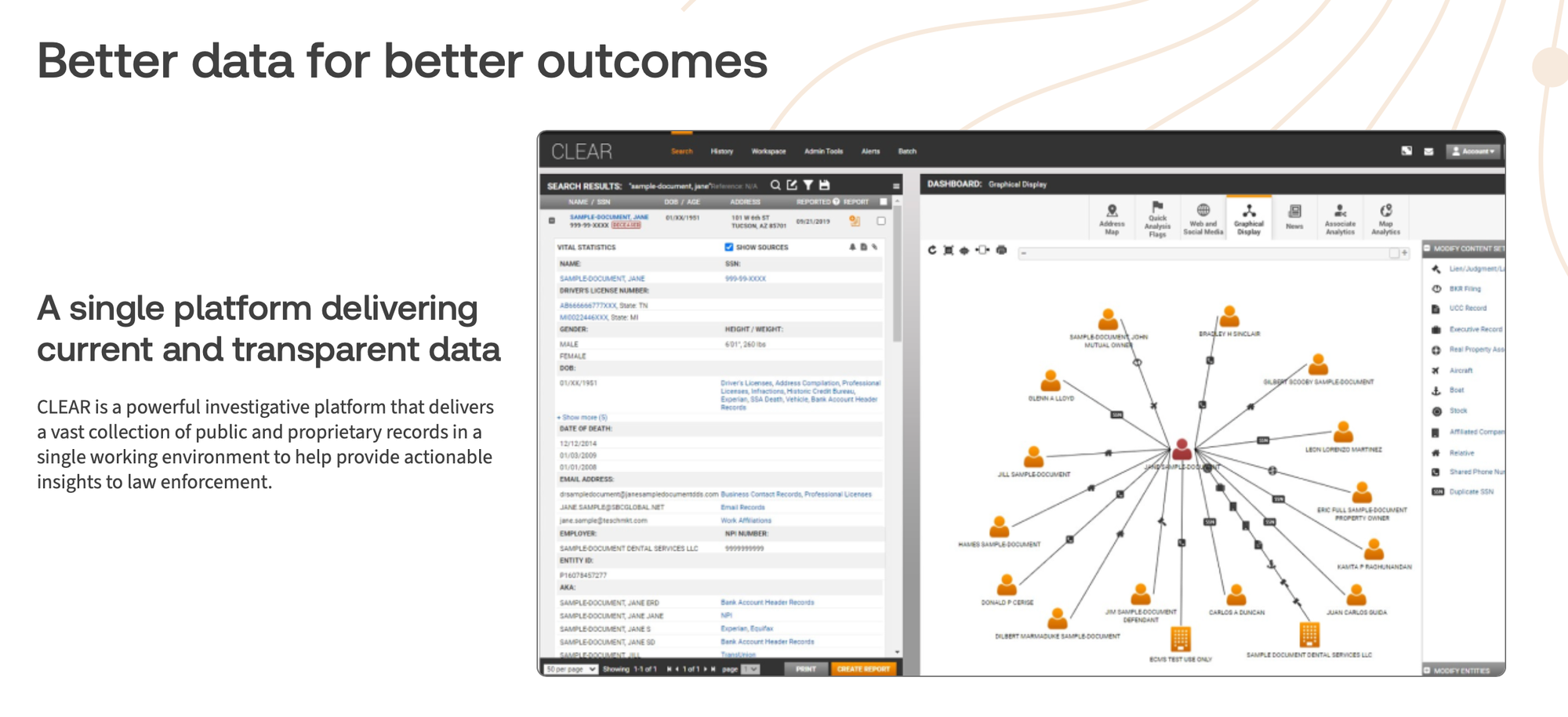 CLEAR is Thomson Reuters’ primary analysis product, which combines data from across public records and the web. That can include details on phone numbers, addresses, associates, and social media activity, according to a video on Thomson Reuters’ website. A document on Thomson Reuters’ website says CLEAR also contains driver license data, credit header data from Experian (which is the personal information, such as addresses, at the top of a credit report), marriage records, vehicle registrations, voter registrations, and much more.