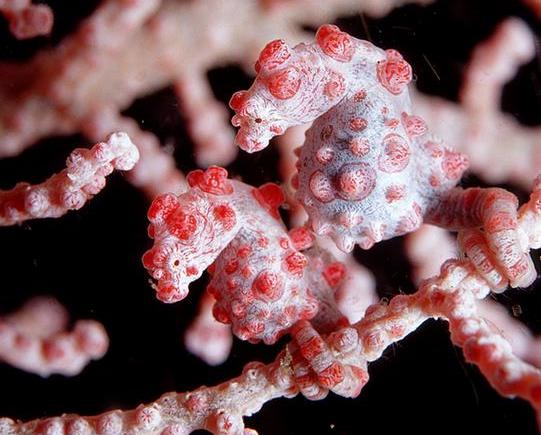 We’ll move now from the extremely epic to the extremely twee. Pygmy seahorses, which measure no more than an inch, mimic the brightly-colored and venomous gorgonian corals that they symbiotically inhabit. Scientists have now discovered that these tiny animals achieved their extraordinary camouflage in part by discarding a host of genes involved in growth and immune response, perhaps because their protective coral habitats rendered those traits obsolete.