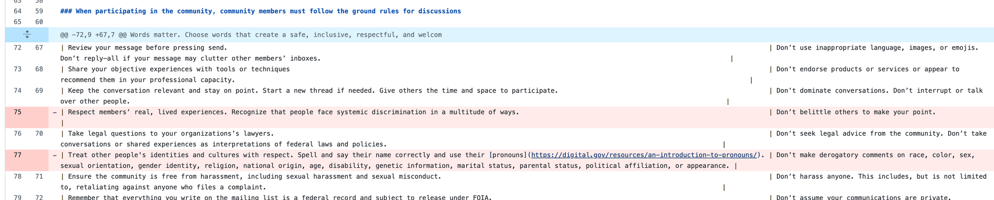 - According to Github, a page about behavioral guidelines for government employees is slated to get rid of a bullet point that says “don’t make derogatory comments on race, color, sex, sexual orientation, gender identity,” though the change has not appeared on the live site yet.