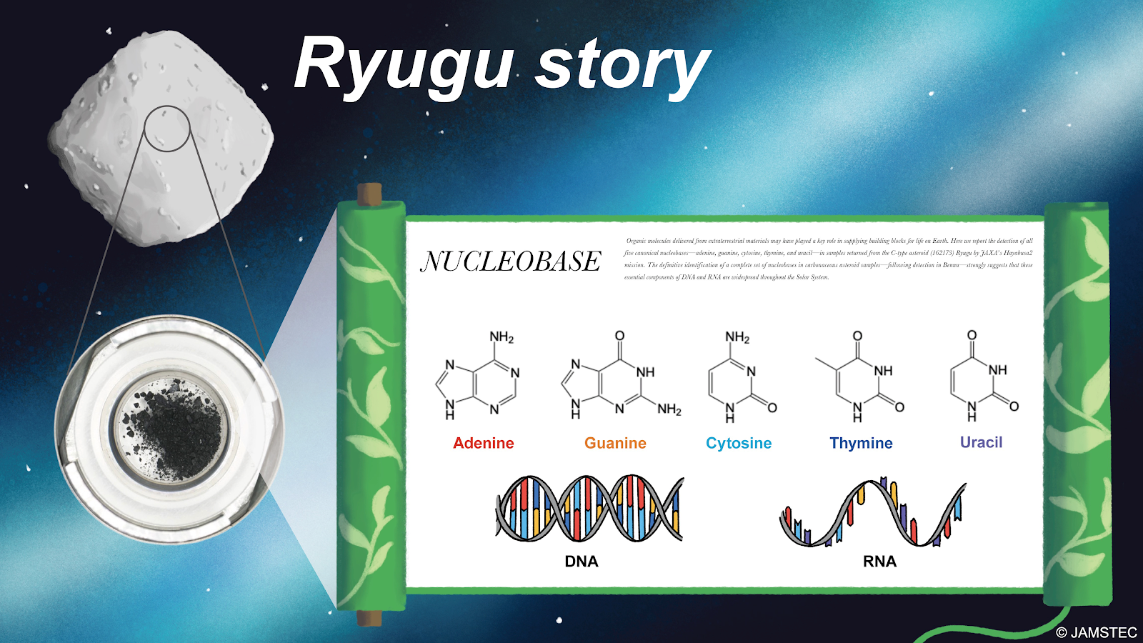 The results were “broadly in line with our expectations, but still very exciting to confirm,” Koga said. “All five nucleobases had already been detected in the Murchison meteorite and in samples from the asteroid Bennu. Since Ryugu is also a carbonaceous asteroid, we expected that these molecules might be present, and it was very satisfying to confirm that the complete set is indeed present in the Ryugu samples.”